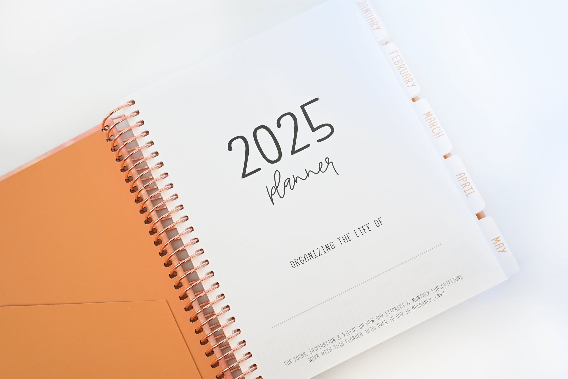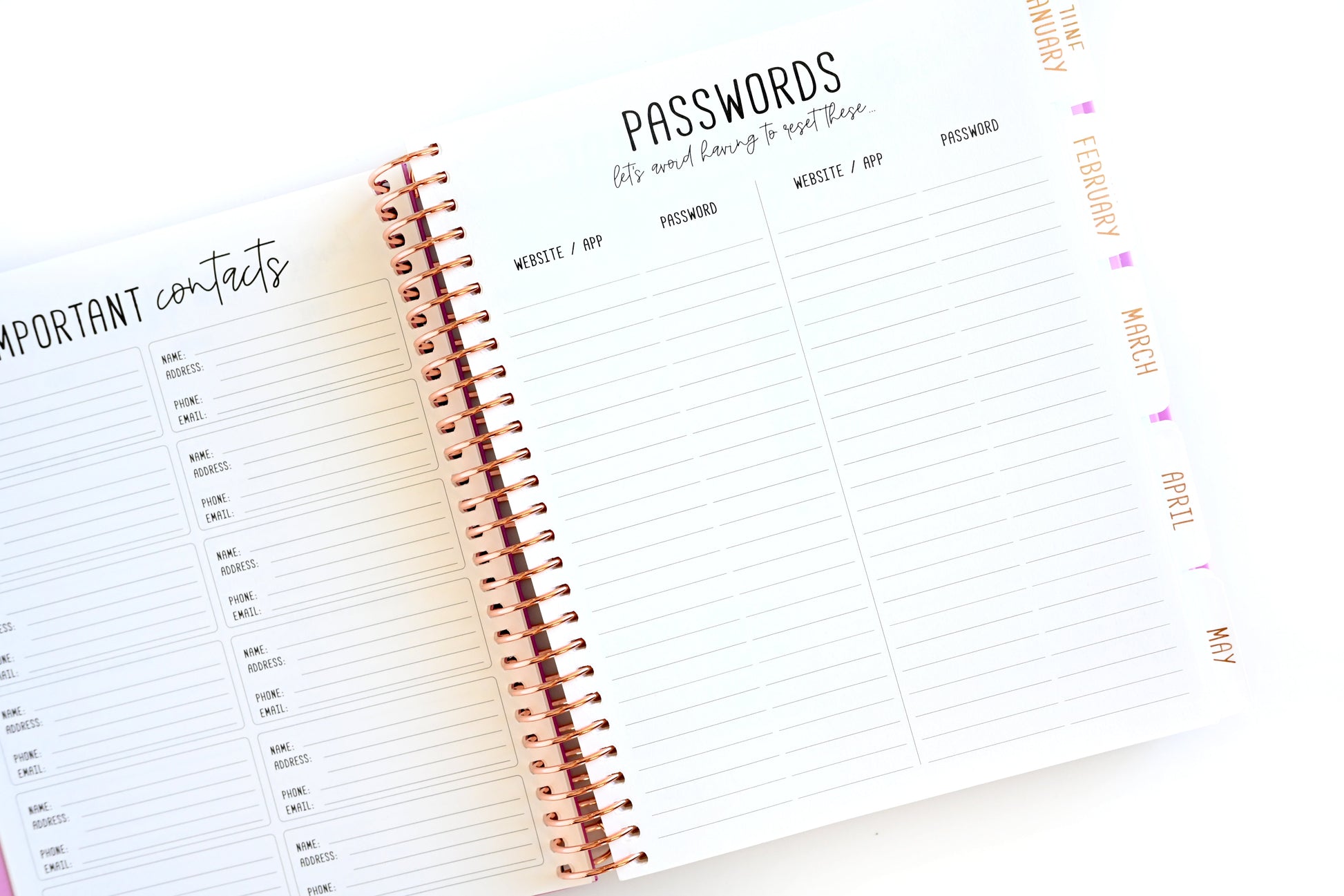 - Rose gold foil on front cover and monthly tabs