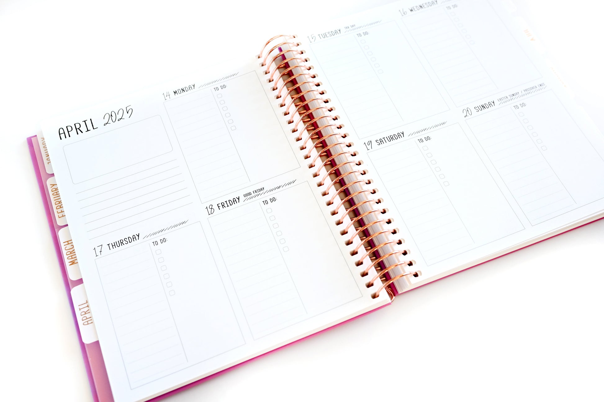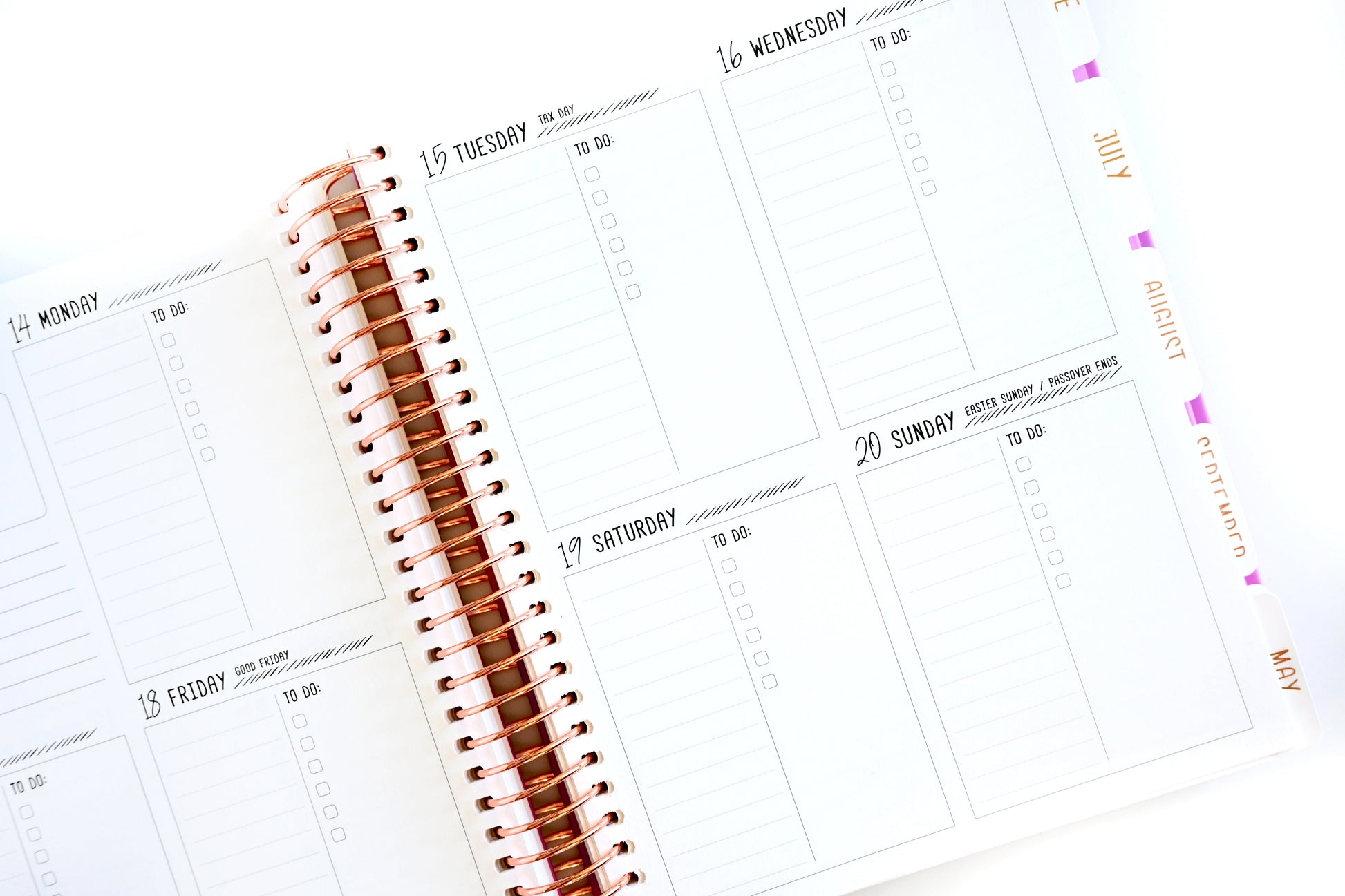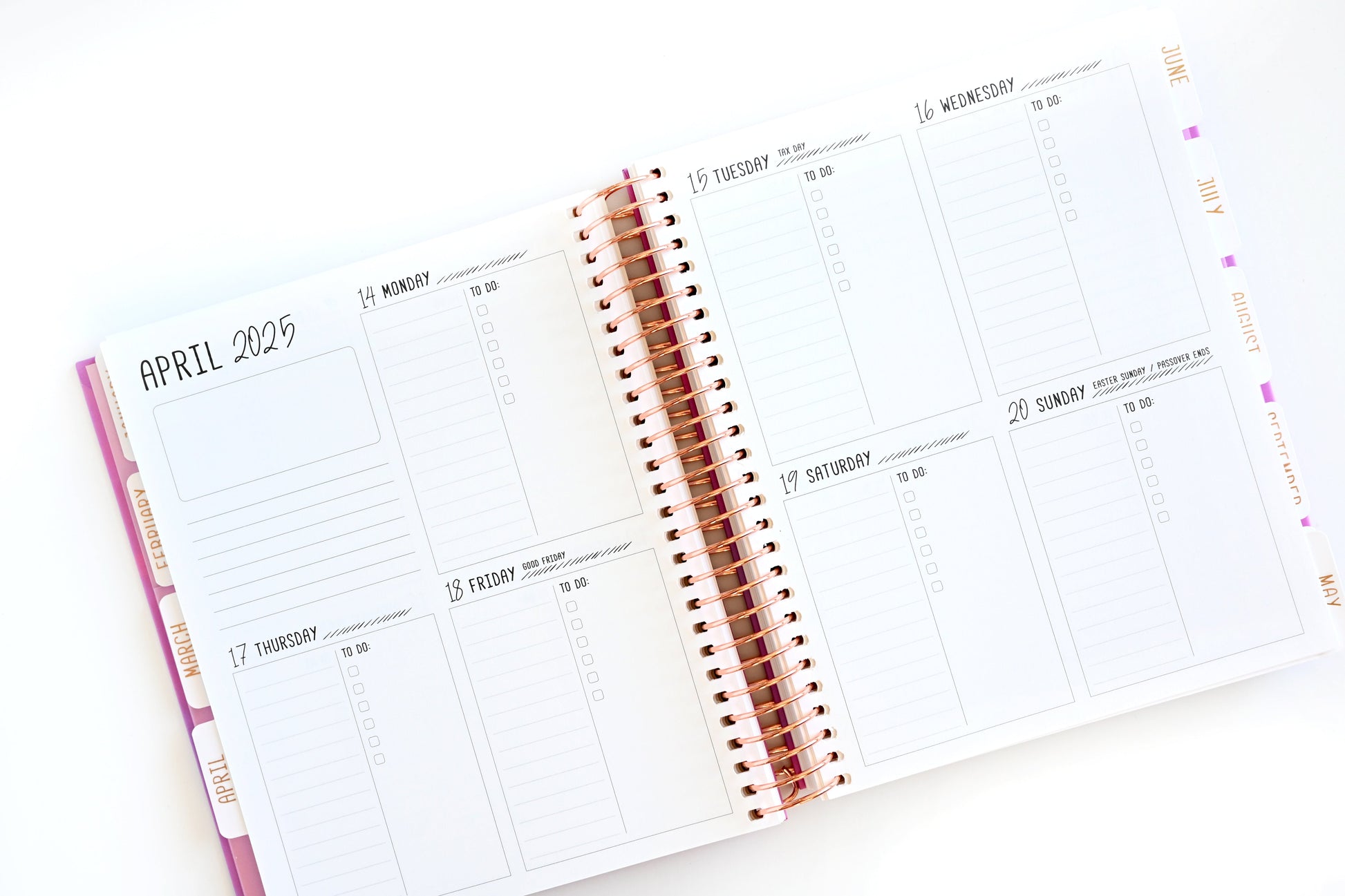 - Rose gold foil on front cover and monthly tabs
