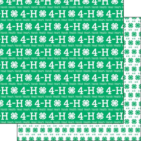 Front side has alternating lines of white "4-H" and a 4-leaf clover, then "Head Heart Hands Health" on a green background The back side has alternating lines of green "4-H", then a 4-leaf clover on a white background.