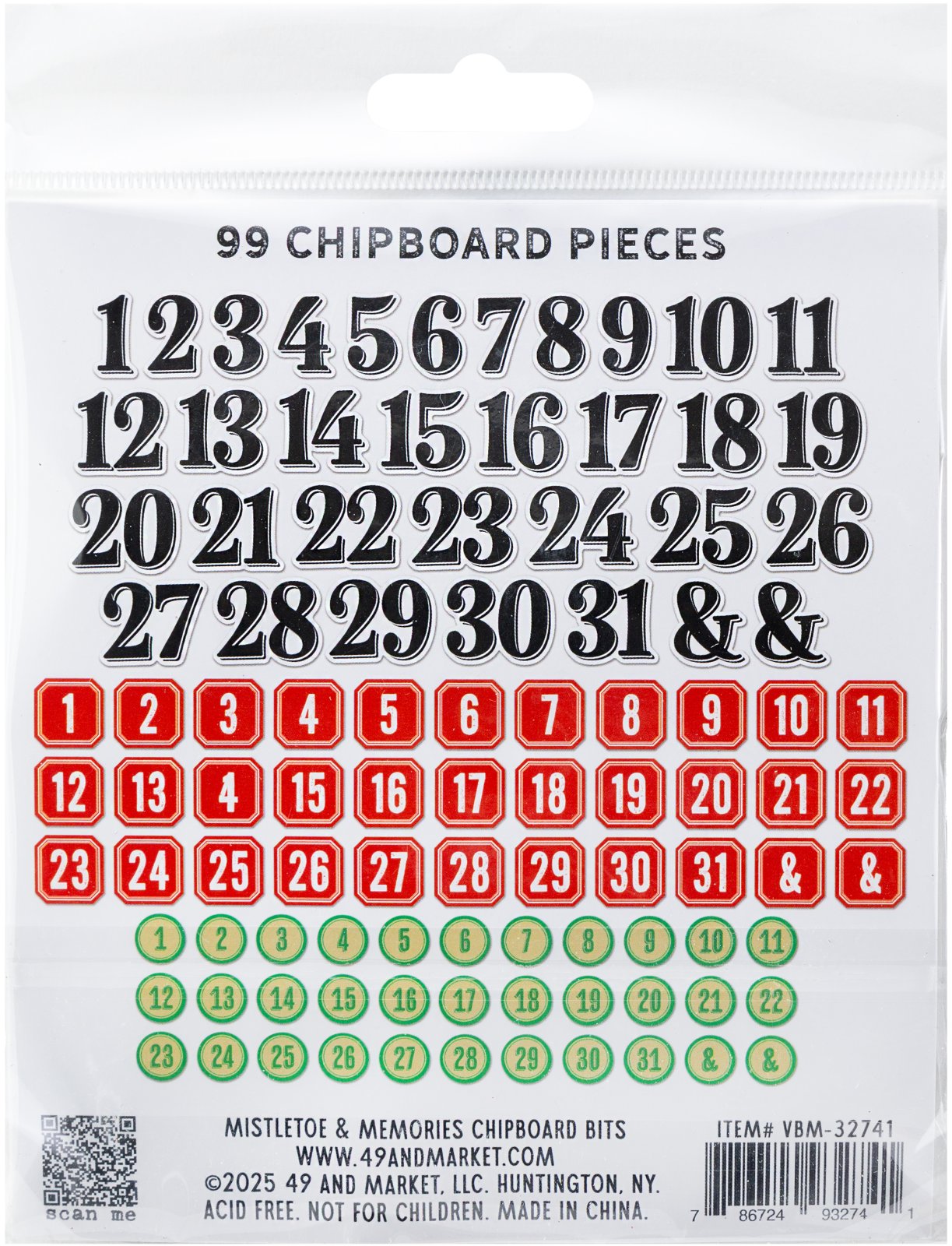 Unleash your holiday creativity with the 49 And Market Chipboard Set-Bits, Mistletoe And Memories. This delightful set includes 99 acid-free chipboard pieces, perfect for adding a festive flair to your scrapbooking, card-making, or holiday decor projects. Each piece is beautifully designed with a charming mix of numbers and symbols in elegant black, vibrant red, and cheerful green, capturing the essence of the holiday spirit. Whether you're crafting a personalized advent calendar or embellishing a cherished memory book, these chipboard bits are your go-to for adding a personal touch. Dive into the holiday season with creativity and style, making every project a keepsake.