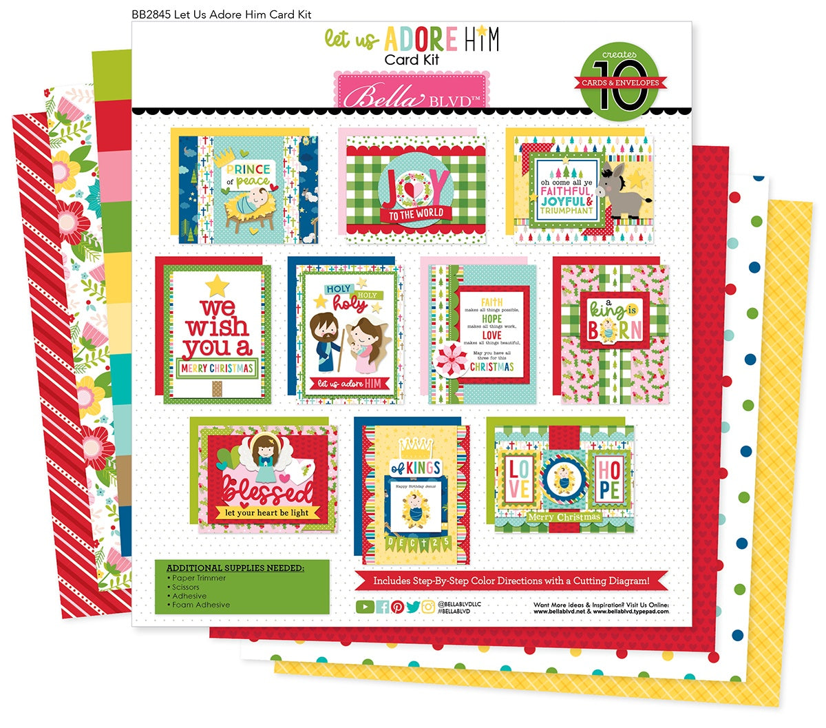 Celebrate the season with the Bella Blvd Card Kit - Let Us Adore Him. Perfect for crafting enthusiasts and Christmas lovers, this kit is a dream with its subtle pinks, dashes of turquoise, and cream-based backgrounds. Create 10 beautiful, festive cards featuring charming layered stickers, all designed to spread joy and warmth. Delight in the darling illustrations of the nativity, baby Jesus, and a special donkey, bringing a touch of whimsy to your holiday greetings. The kit includes step-by-step color directions and a cutting diagram, ensuring a seamless crafting experience. Ideal for making spirits bright, this card kit is your go-to for heartfelt, handmade Christmas cards.