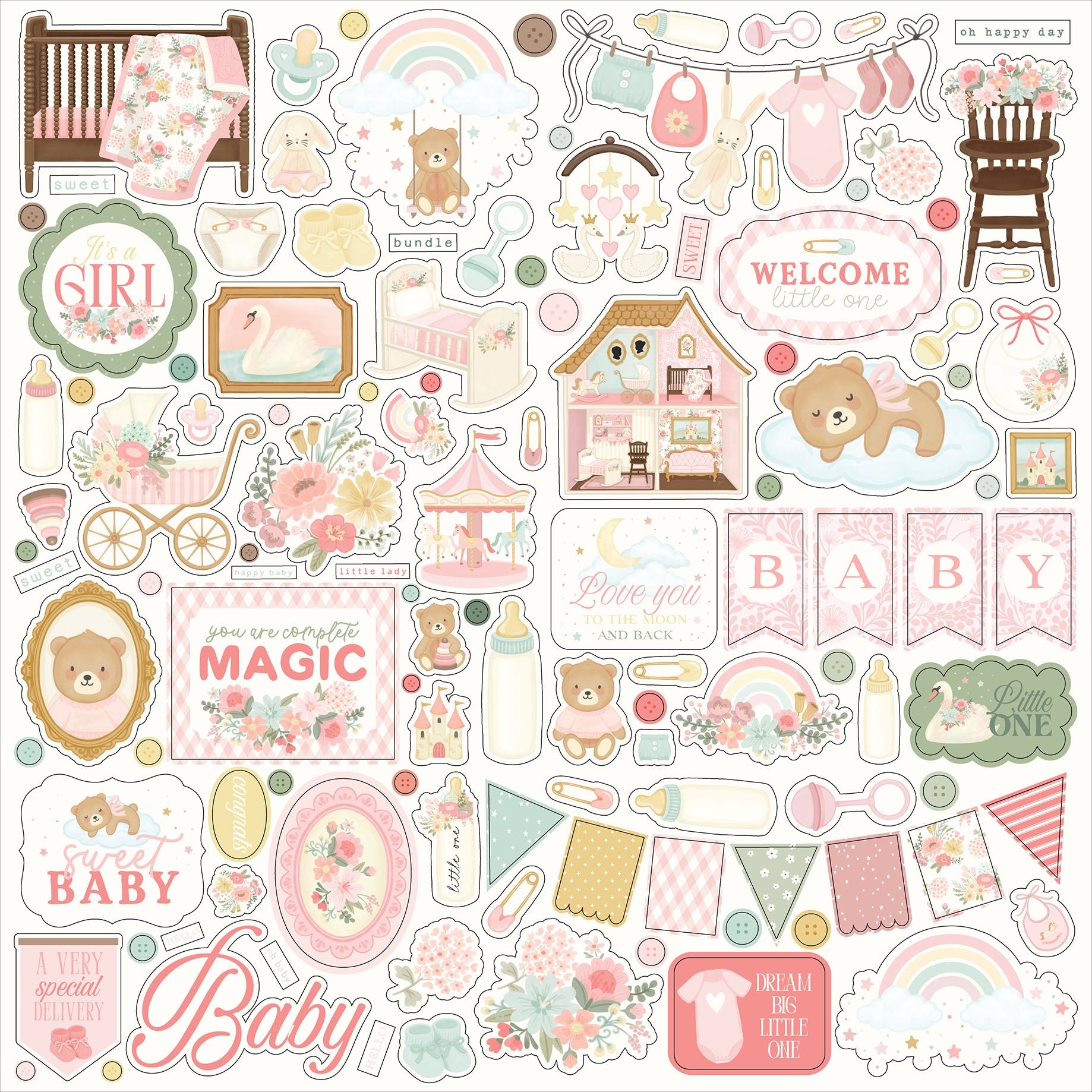Capture the magic of your baby girl's early days with the Carta Bella Elements Cardstock Stickers - Little Lullabies Baby Girl. Perfect for scrapbooking, card-making, or nursery decor, this 12"x12" sheet is brimming with adorable designs that celebrate your little one. Featuring charming illustrations like teddy bears, baby bottles, and delicate florals, each sticker adds a touch of whimsy and warmth to your projects. Made by Echo Park Paper, these high-quality cardstock stickers are easy to peel and stick, ensuring a seamless crafting experience. Whether you're creating a baby album or decorating a nursery, these stickers will help you preserve precious memories in the sweetest way. Let your creativity shine and cherish every moment with this delightful collection.