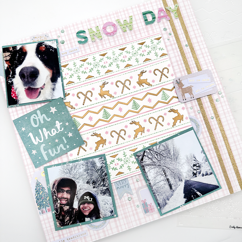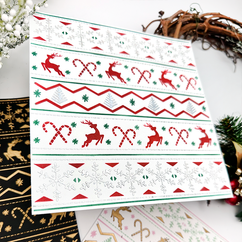 - Images: Reindeer, candy canes, snowflakes, pine trees, zigzag stripes