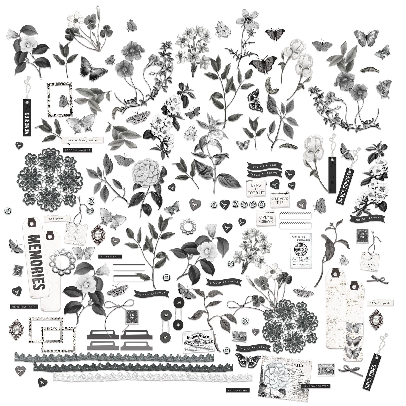 The mini laser cut set includes 147 smaller elements on 4 sheets that measure 6x8 inch sheets. There are precision-cut elements of foliage, florals, butterflies, tabs, borders, bows, frames, buttons, tickets, tags and journaling pieces.
