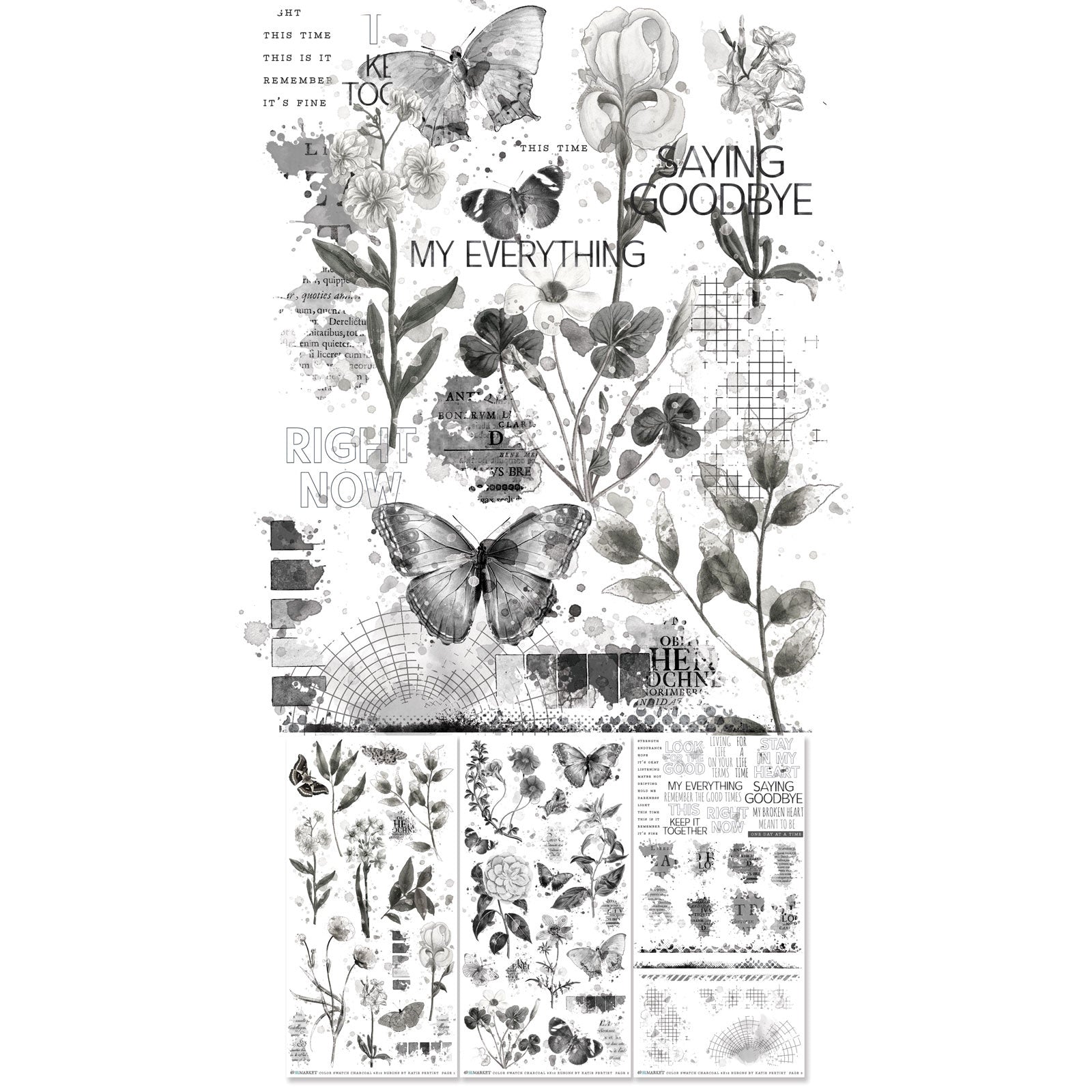 3 sheets of 6x12 inch premium quality rub-on transfers. Each sheet is loaded with various imagery in shades of Charcoal. Elements of florals, textures, word art and more make up this set. They can be applied to a variety of clean surfaces for a unique and beautiful effect.