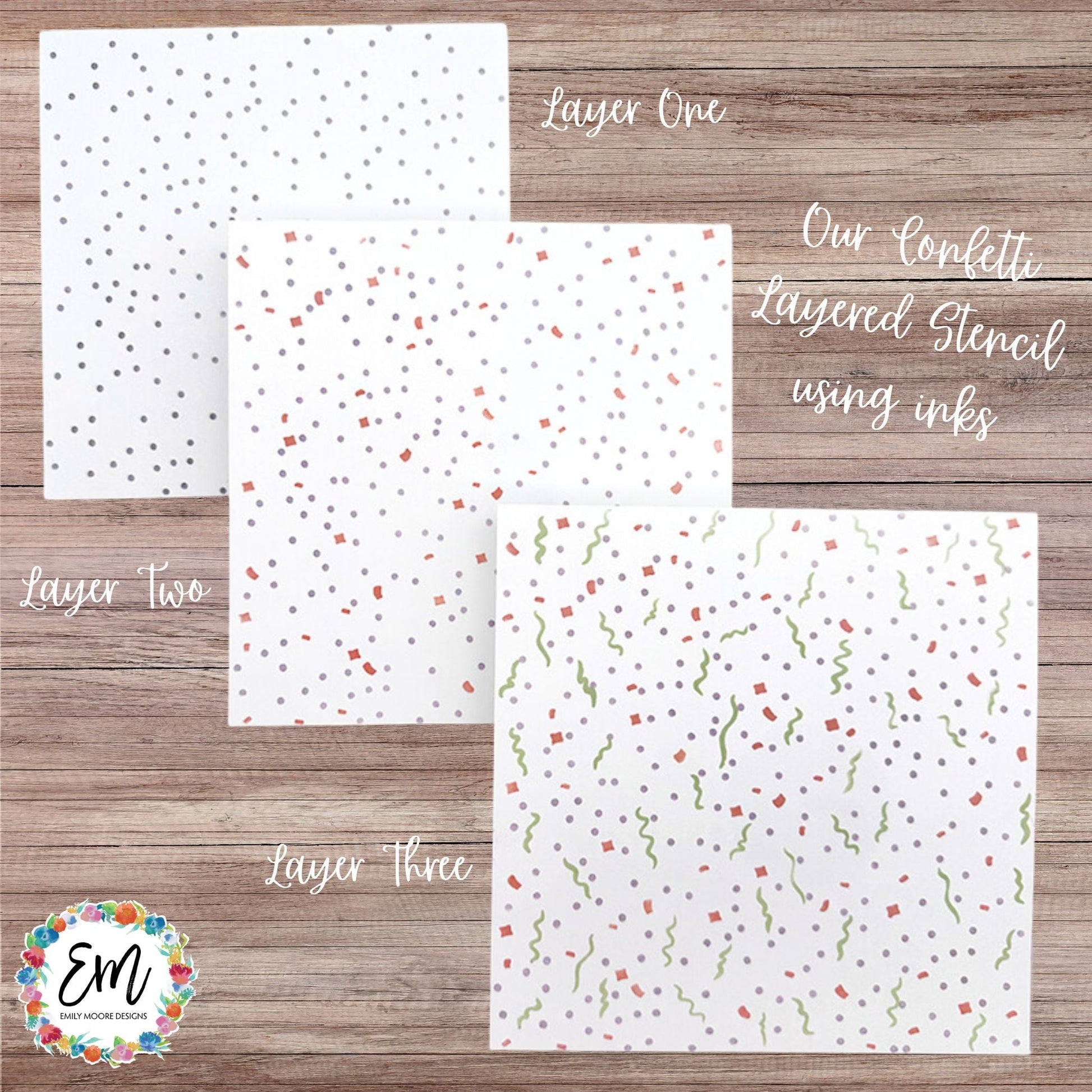 Bring the party to your papercrafts with the Confetti Layered Stencil Set from Emily Moore Designs! This cheerful trio of 6" x 6" stencils allows you to layer in playful confetti patterns for dimensional backgrounds full of celebration. Perfect for birthdays, graduations, New Year's cards, and more, these stencils are designed for easy alignment and crisp results with ink blending, pastes, and sprays. Add festive flair to handmade cards, party decor, journal pages, and mixed media art with ease.