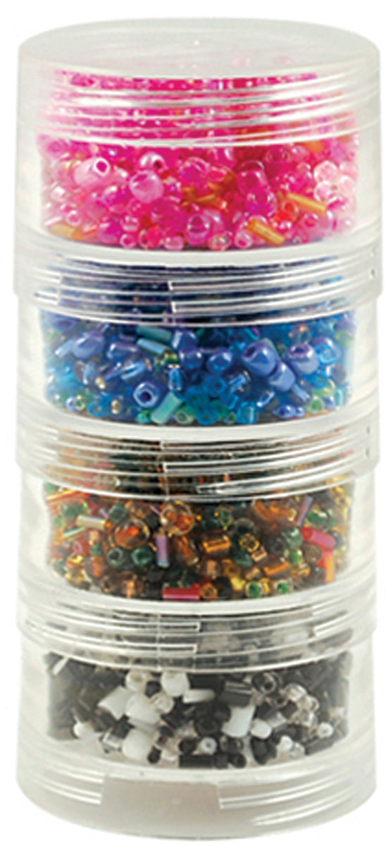 MULTICRAFT IMPORTS-Craft Medley: Screw-Stack Canisters. Store all kinds of beads and baubles in these clear plastic storage jars. They have a convenient screw-together design where the base of one acts as the lid of another making once compact unit. A single lid is included for the uppermost container. Each individual jar has a diameter of 1-7/8 inches, a depth of 3/4 inch, and will hold approximately 1.1 ounces. This package includes four empty containers and one lid. Imported.