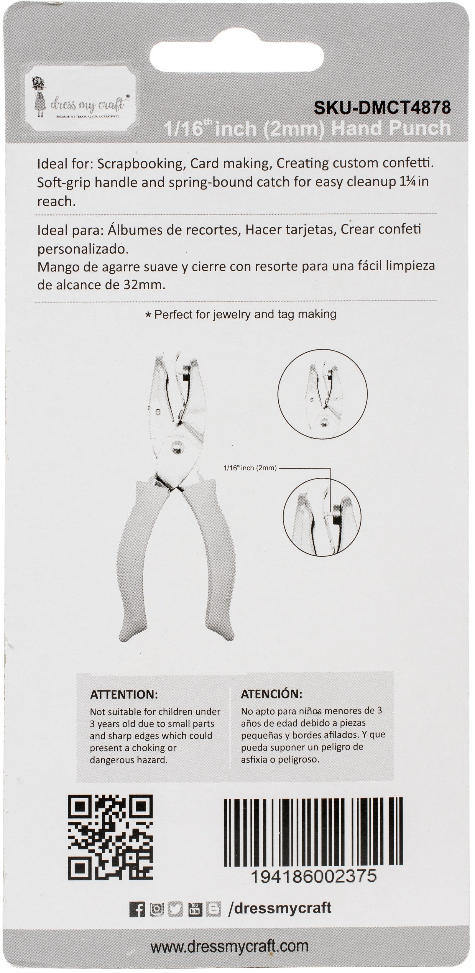 Ideal for scrapbooking, card making or creating custom confetti! It has a soft-grip handle and spring-bound catch for easy clean up. This package contains one 2mm hand punch. WARNING: Choking Hazard- small parts. Not for children under 3 years. Imported.