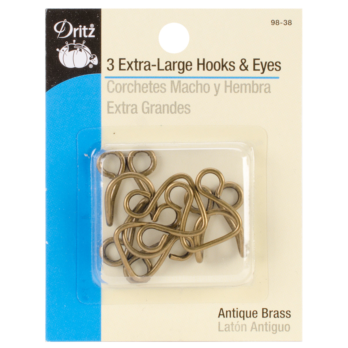 DRITZ: Extra-Large Hook & Eyes. Use these closures for holding finished edges together! This package contains three extra-large metal hook and eye sets. Available in a variety of colors, each sold separately. Imported.