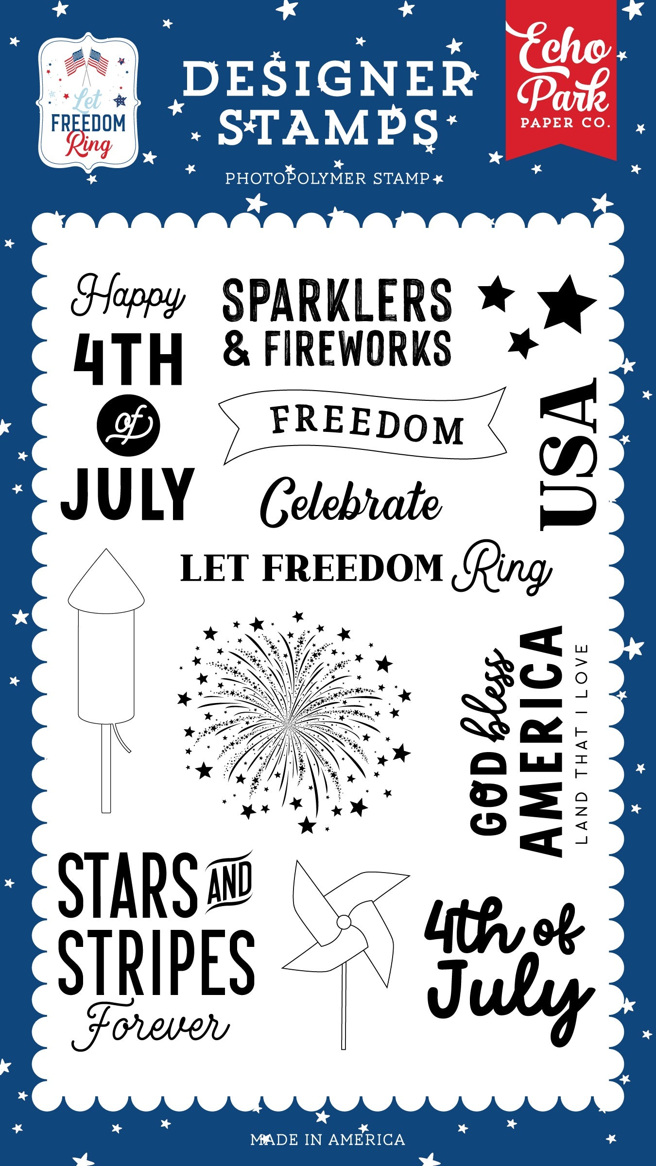 It's time to celebrate with sparklers and fireworks! Echo Park's Freedom photopolymer designer stamps are of the highest quality. This package contains 13 stamps. For use with acrylic stamping blocks and stamping ink (not included). WARNING: Choking Hazard. Not suitable for children under 3 years. Made in the USA.