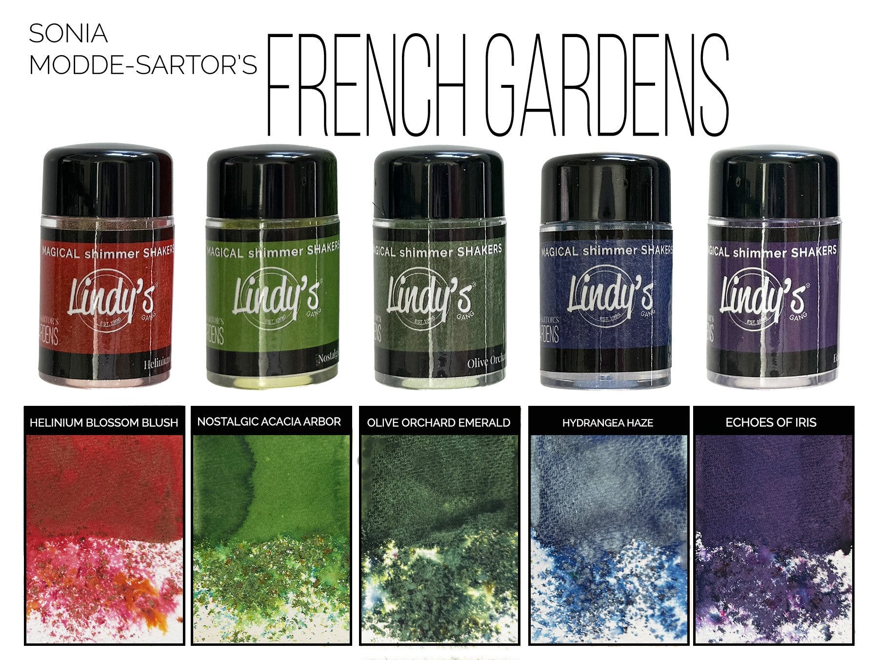 Unleash your creativity with Lindy's Stamp Gang Magical Shaker 2.0 Set - Sonia's French Garden. This enchanting set of five vibrant shakers is perfect for artists and crafters looking to add a touch of magic to their projects. Each shaker features a unique blend of shimmery powders, including Helinium Blossom Blush, Nostalgic Acacia Arbor, Olive Orchard Emerald, Hydrangea Haze, and Echoes of Iris, allowing you to create stunning, multi-dimensional effects. Simply sprinkle, spritz with water, and watch the colors bloom into life. Ideal for scrapbooking, card making, and mixed media art, these shakers provide endless possibilities to transform your work into a masterpiece. Let your imagination run wild with the captivating hues of Sonia's French Garden.
