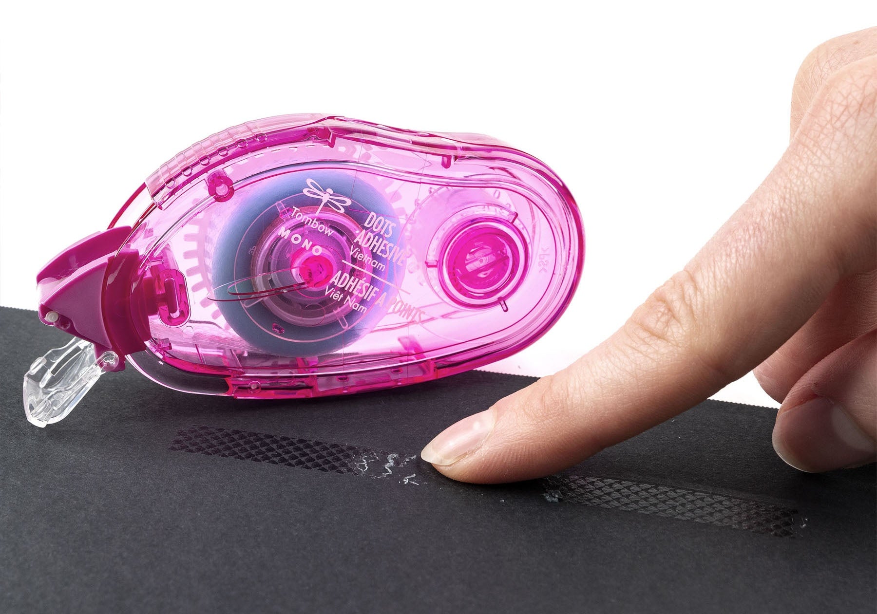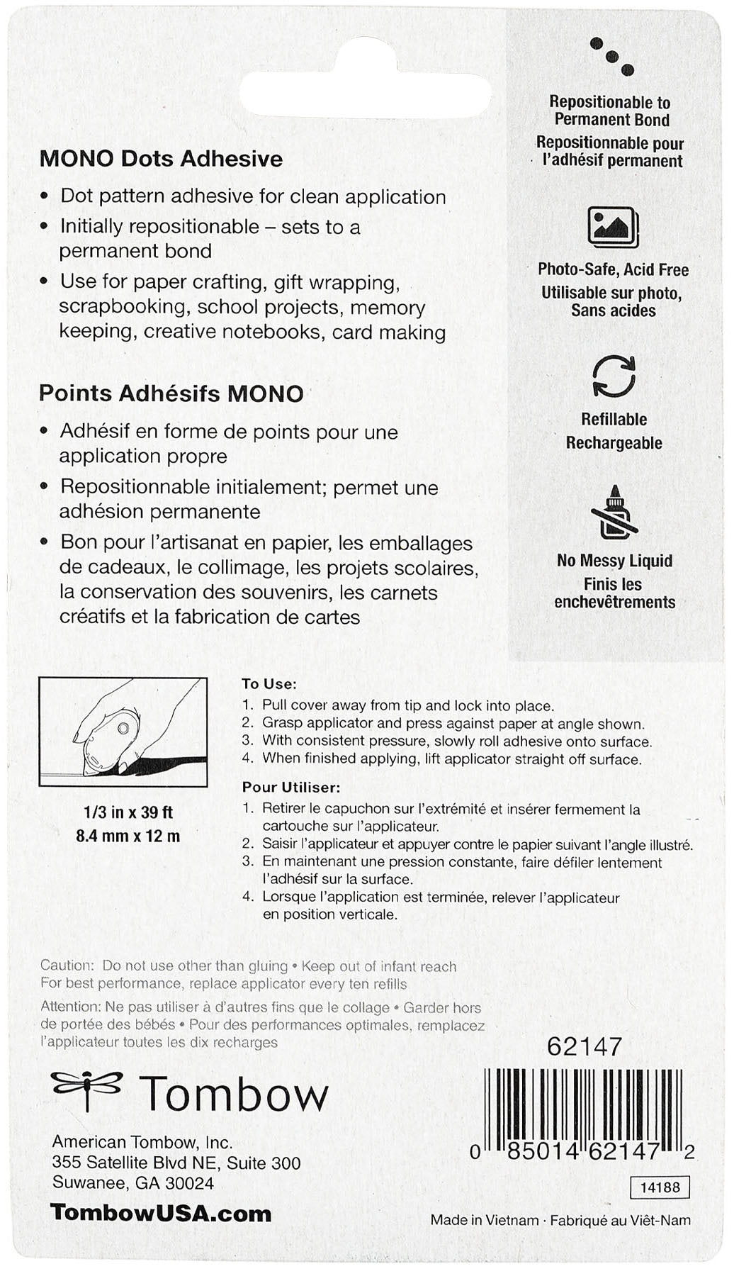 This dot adhesive will not string or break. It's easy to use applicator with roller tip is for smooth application. Simple to refill with a snap in cartridge that is color coded. Apply either straight or curved line for exact placement. This package contains 39 feet of .33 inch wide adhesive dots. Non-toxic. Acid free. Archival quality. Photo safe. Imported.