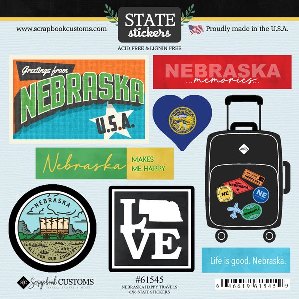 Celebrate your Nebraska adventures with the Nebraska Happy Travels 6 x 6 Sticker set from Scrapbook Customs. Perfect for scrapbooking enthusiasts and travel aficionados, these vibrant, acid and lignin-free stickers capture the essence of the Cornhusker State. Each sticker features unique designs that echo Nebraska's charm, from iconic state symbols to cheerful travel motifs. Whether you're personalizing a scrapbook, decorating a travel journal, or creating a memento of your journey, these durable stickers offer a splash of color and nostalgia. Proudly made in the USA, they ensure your Nebraska memories are preserved beautifully. Embrace the spirit of Nebraska and let your creativity shine!