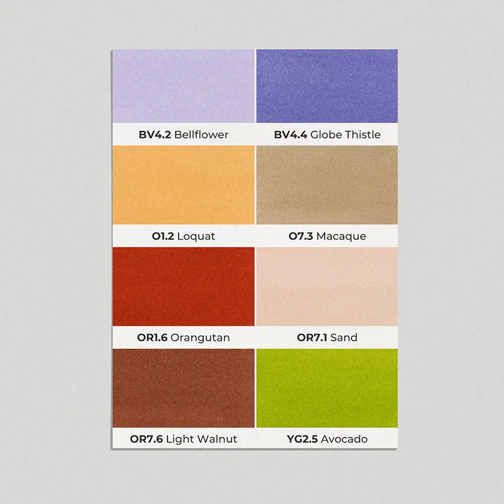 Colors in the set: BV4.2 Bellflower, BV4.4 Globe Thistle, O1.2 Loquat, O7.3 Macaque, OR1.6 Orangutan, OR7.1 Sand, OR7.6 Light Walnut, YG2.5 Avocado