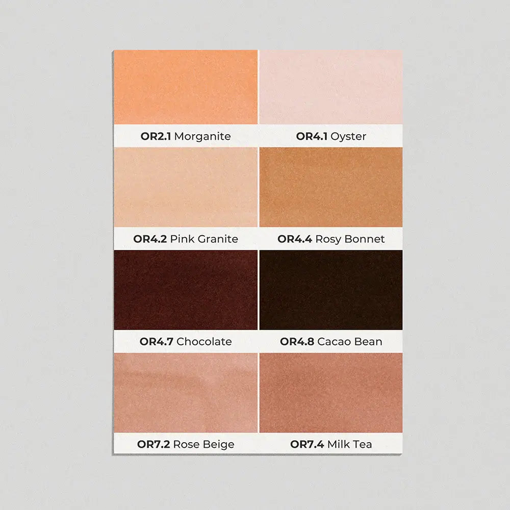 Colors in the set: OR2.1 Morganite, OR4.1 Oyster, OR4.2 Pink Granite, OR4.4 Rosy Bonnet, OR4.7 Chocolate, OR4.8 Cacao Bean, OR7.2 Rose Beige, OR7.4 Milk Tea.