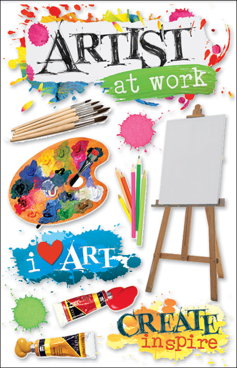 PAPER HOUSE-3D Stickers: Art Class. Colorful 3-dimensional stickers perfect for any paper craft! Use them in cards, scrapbooks, home decor and more! This package contains one 7x4-1/2 inch sheet of 11 stickers with an art class theme. Imported.