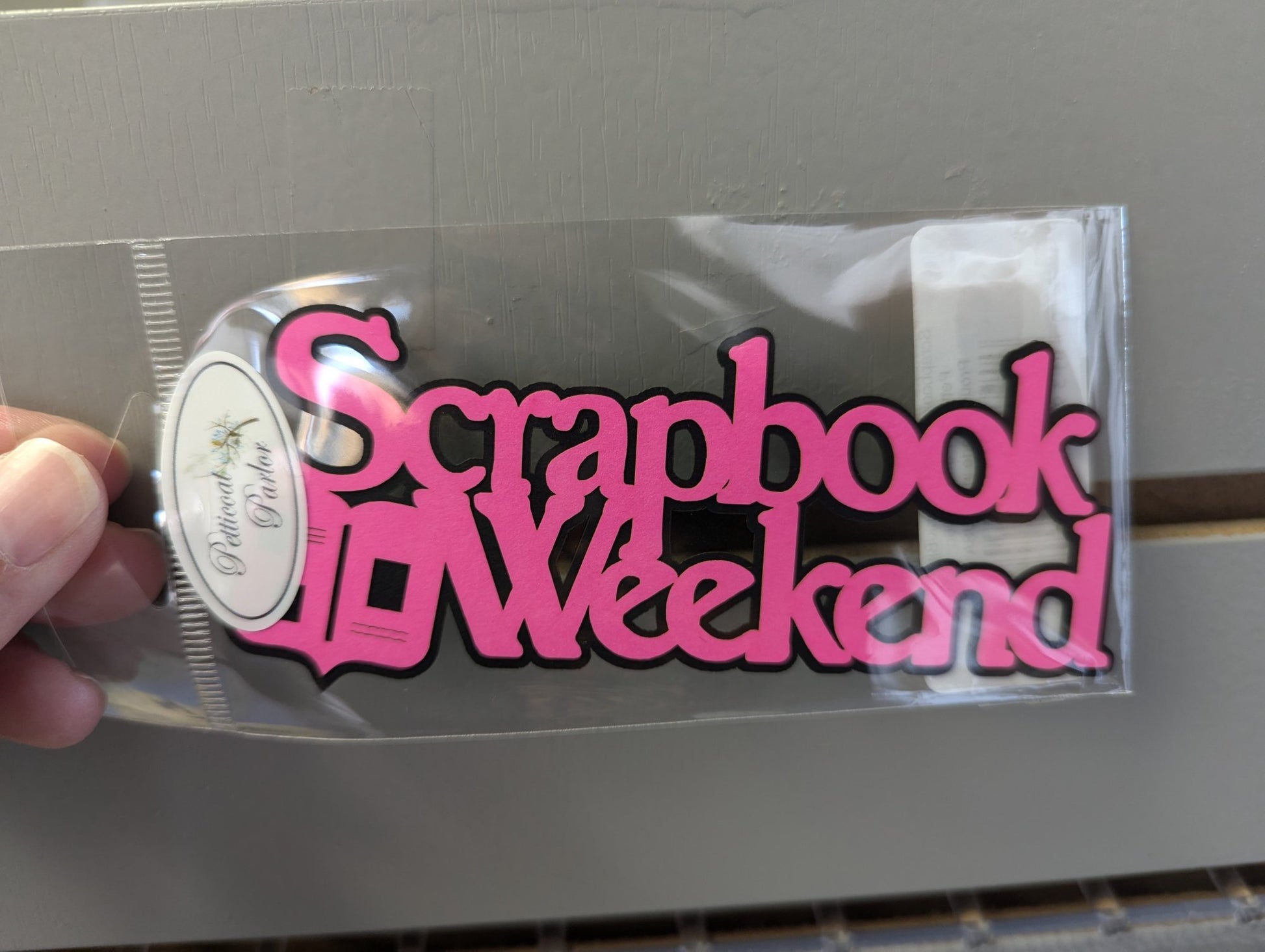 Elevate your scrapbook projects with the Petticoat Parlor Scrapbook Weekend Title in vibrant pink on a sleek black background. Perfect for passionate crafters and memory keepers, this eye-catching embellishment adds a pop of color and a touch of flair to your pages. Crafted with precision, the bold typography ensures your scrapbook stands out, capturing the essence of those cherished weekend memories. Whether you're documenting a getaway or a crafting retreat, this title piece is your go-to for adding personality and style. Lightweight and easy to apply, it's the ideal addition to any scrapbooker's toolkit. Let your creativity shine with Petticoat Parlor!