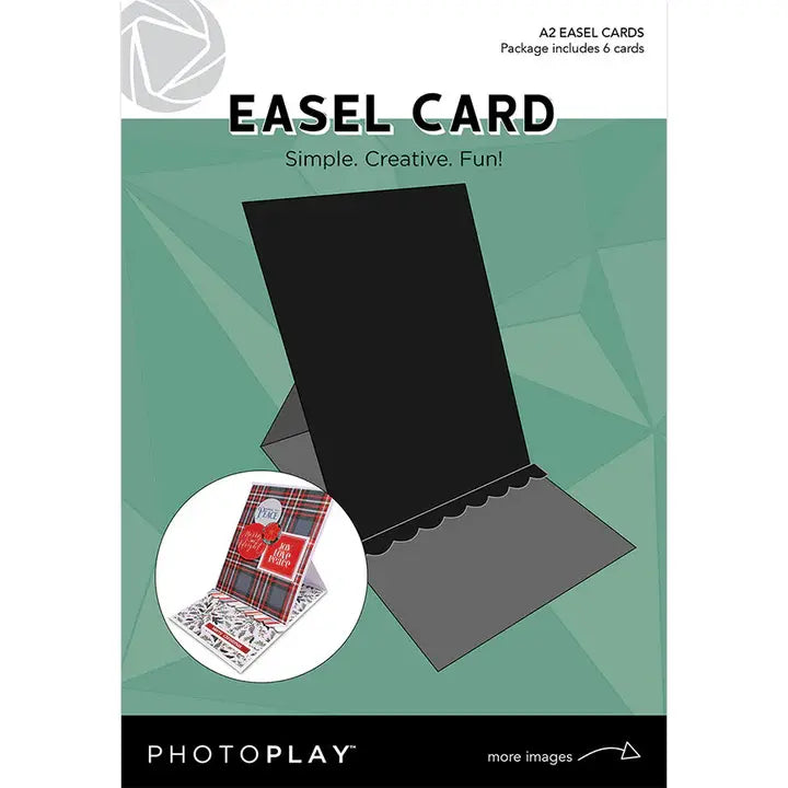 Unleash your creativity with the Photoplay A2 Easel Cards in sleek black. This set of six cards is perfect for crafting personalized greeting cards that stand out. Each card is designed to provide a sturdy and elegant base, ideal for showcasing your artistic flair with a professional touch. The rich black color offers a striking backdrop, allowing your embellishments, stamps, and designs to pop with vibrancy. Interactive A2 Easel Cards - Package contains 6 cards and step-by-step instructions. Whether you're crafting for birthdays, holidays, or special occasions, these easel cards ensure your heartfelt messages are presented with style and sophistication. Elevate your card-making game and impress your recipients with these versatile, high-quality easel cards.