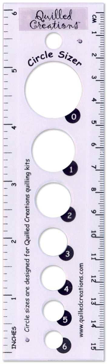 QUILLED CREATIONS-Circle Sizer Ruler Quilling Tool. Handy, compact and functional! This ruler is a simplified version of the Circle Template Board with hole sizes that coordinates with all quilling kits. Just roll a strip of paper and place it in a hole, adjust tightness of roll and it is easily sized to make the perfect size coil for any project! This package contains one 6in ruler with inches to the 1/8in, centimeter to the millimeter and seven popular Quilling circle sizes: 0, 1, 2, 3, 4, 5 & 6. Imported.
