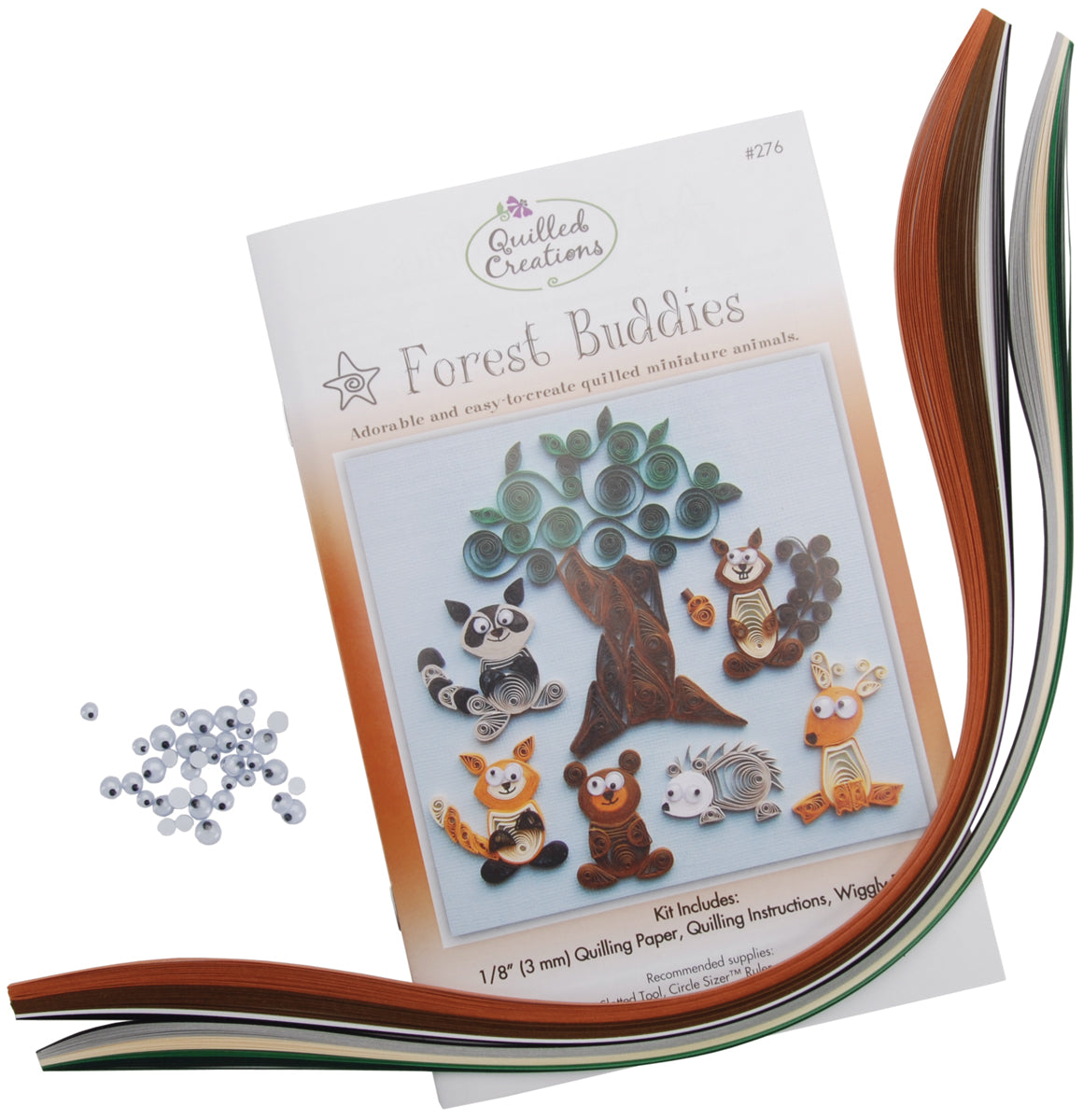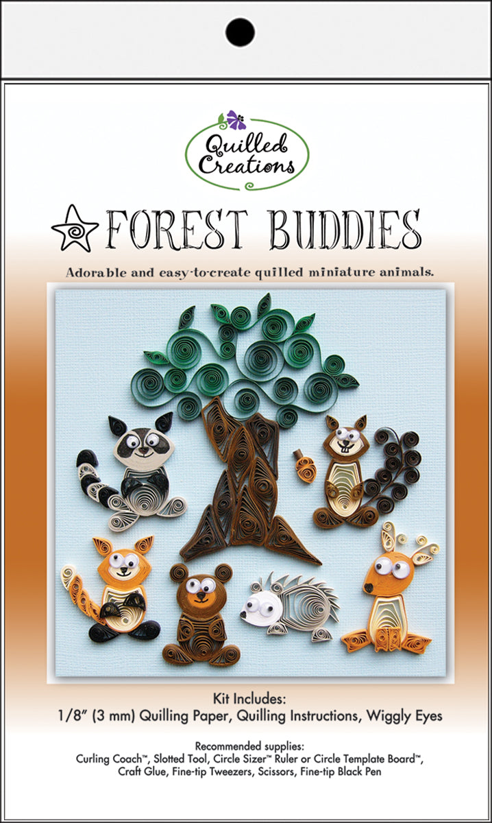 QUILLED CREATIONS-Quilling Kit: Forest Buddies. Create these adorable woodland creatures (raccoon, squirrel, deer, fox, bear and porcupine), a tree and an acorn for scrapbook layouts, greeting cards and home decor. This kit contains Quilling Creations quilling paper, wiggly eyes and instructions. Additional supplies: slotted tool, curling coach, circle sizer, tweezers, scissors, straight pins, fine tipped black pen and craft glue (not included). Made in USA.