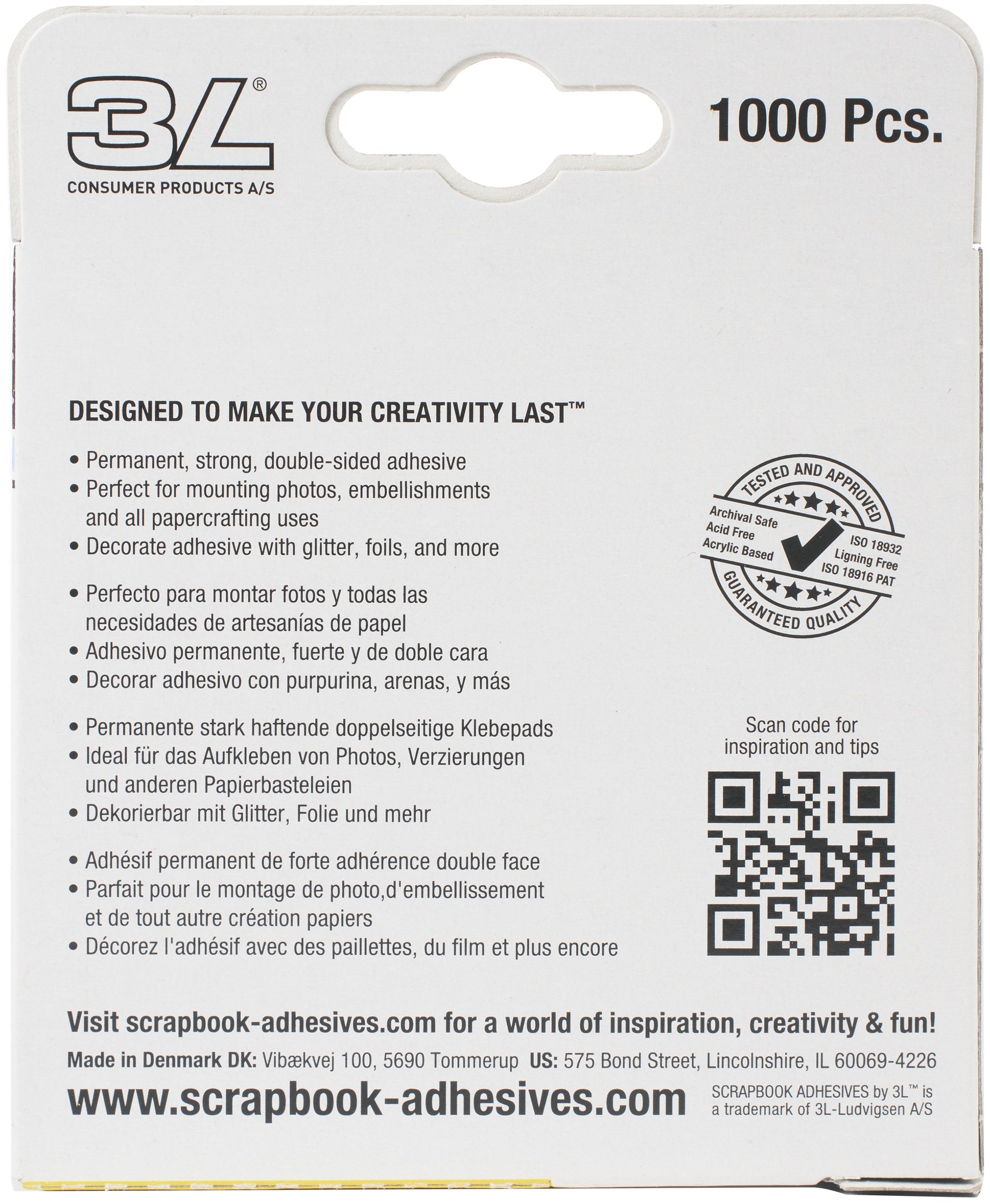 Permanent, strong, double-sided adhesive. Perfect for mounting photos, embellishments and all papercrafting uses. Decorate with glitter, foils and more. This package contains 1000 .5x.5 inch permanent mounting squares. Acid and lignin free. Archival safe. Imported.