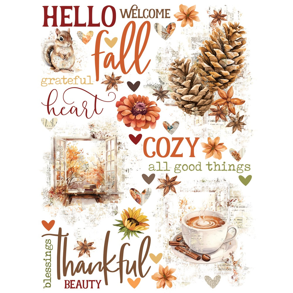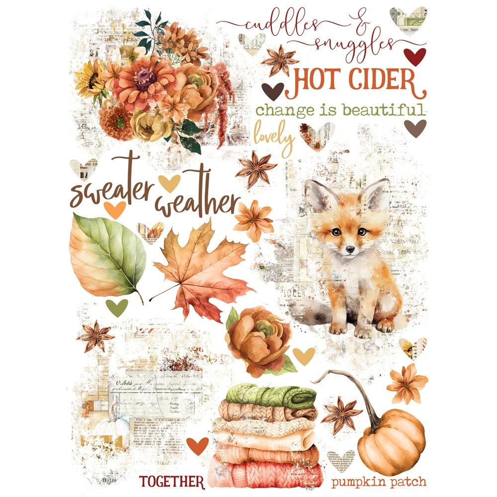 A rich and elegant Simple Vintage collection featuring pumpkins, sunflowers, and cozy home-inspired desgins. This package contains Rub-On Transfers on Two 6x8 Sheets