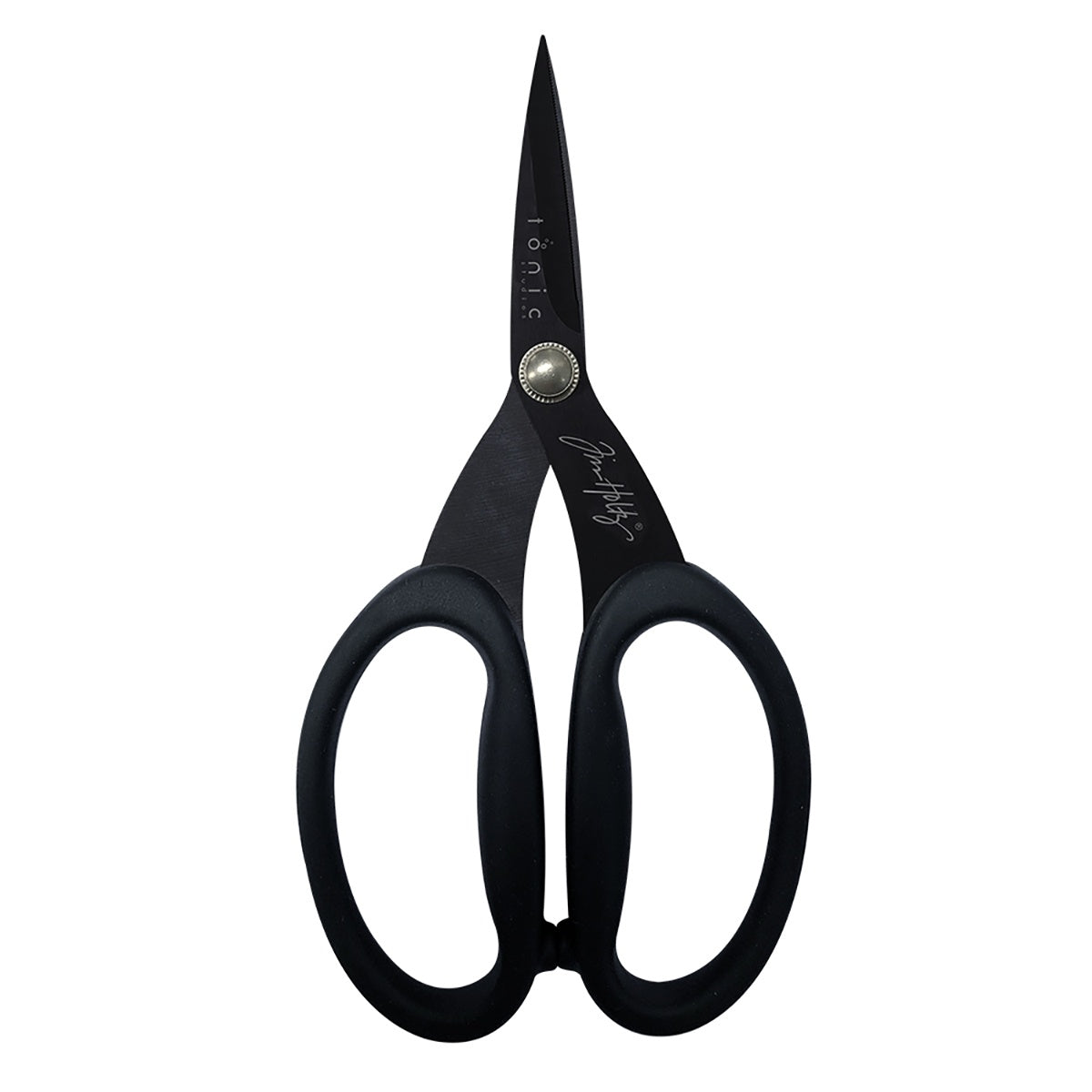 TONIC STUDIOS-Tim Holtz 7in Kushgrip Non-Stick Micro Scissors. These scissors are being endorsed by Tim Holtz because of their overall quality, their duo-tipped feature (one serrated blade and one fine point sharp tip blade) for excellent cutting on all types of materials: great for detail cutting. Use at home, office, school, for crafts, scrapbooking and other hobby projects. Extra Large soft cushion over-molding plastic handles offers a comfortable grip for hours of use and less fatigue. Non-stick coating means no build up of adhesive. Scissors come with a sheath for blade protection and safe handling. Imported.