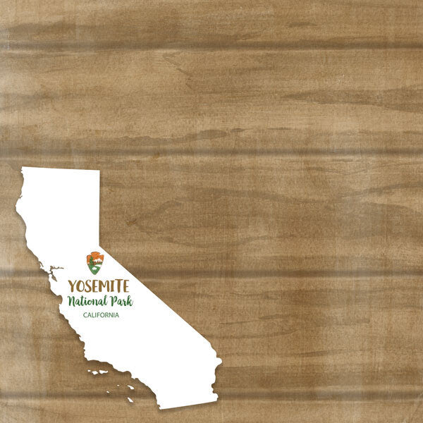 Front has a photograph style watercolor scene of Yosemite National Park with a park sign in the forground. Back has a California state map with the park location and a title in the center of the state shape on a wood plank background.